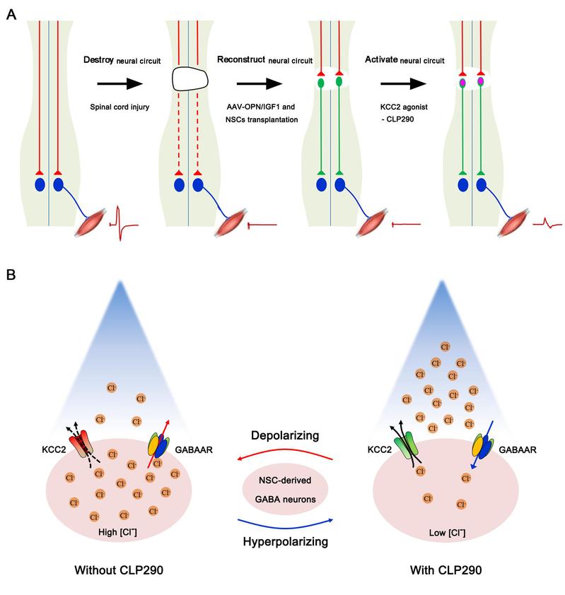 研究团队构建了一个系统性的修复方案,包括:上调促再生基因(OPN/IGF1),提升损伤神经元的内在再生潜能;移植神经干细胞(NSCs),重建丢失组织并提供新突触形成的结构支架;药物激活 KCC2,恢复脊髓局部神经环路的兴奋性平衡、提高新生突触连接的信号传递效率;结合行为学、电生理及组织学多维评估,系统验证“再生-连接-信号传导-功能恢复”的完整链条。