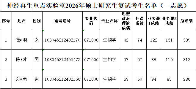 神经再生重点实验室2026年硕士研究生一志愿复试考生名单